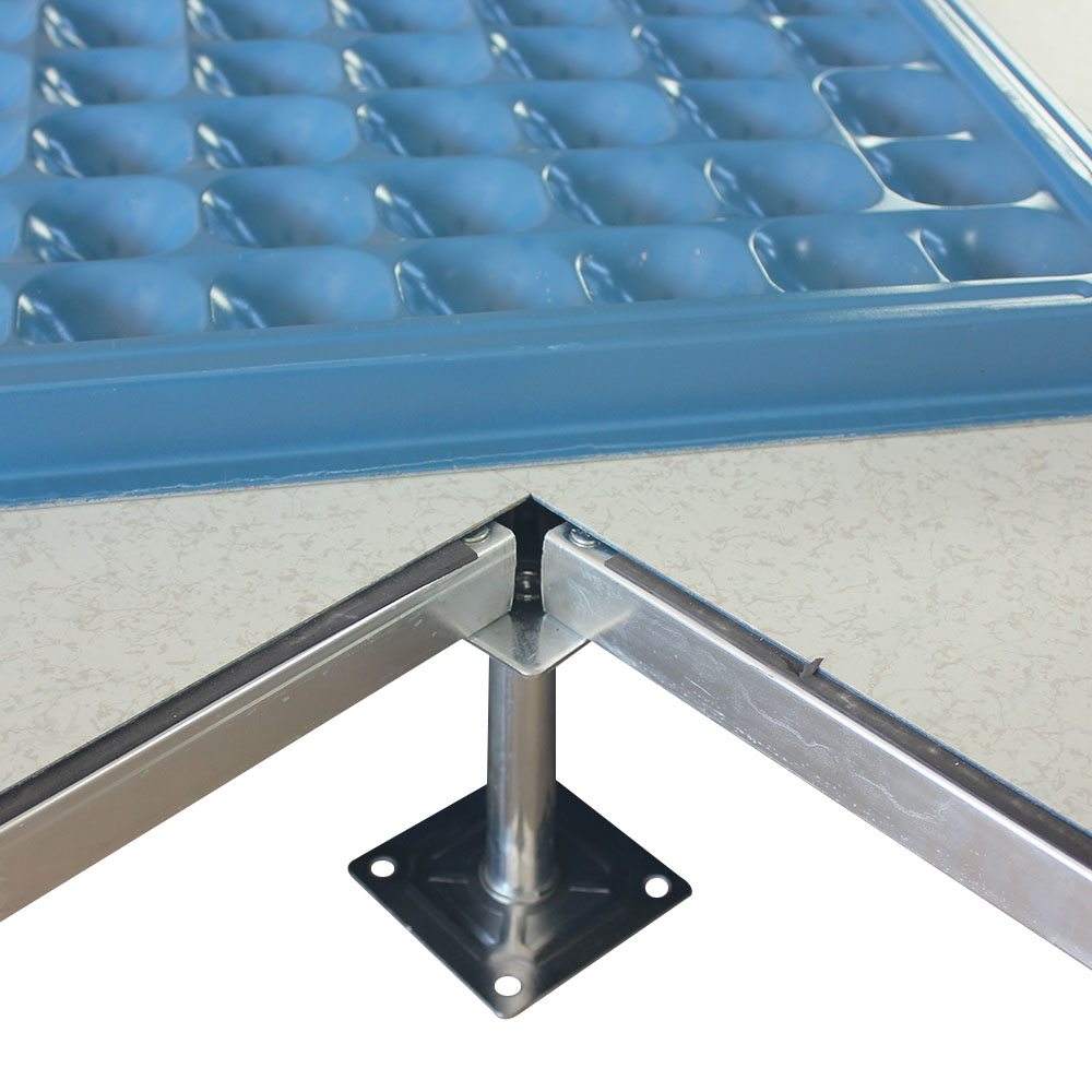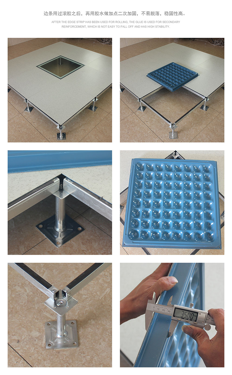 全钢防静电地板为全钢组件,分有边、无边、微边(三种边处理方式)。底面采用SPCC深冲冷轧板拉伸成型钢板厚度(0.4~1.5mm),球窝状结构,增加地板的机械荷载强度。面板采用硬质SPCC钢板(0.5~2.0mm),上下经过点焊焊接成型,切边冲孔后,经防锈处理,环氧树脂粉末静电喷涂后,中间填充发泡水泥(可以根据客户需求发泡不同重量),再经过日晒养护后形成稳定的承载结构。地板上表层粘贴防火板(HPL)/复合PVC/ 通体PVC/陶瓷地砖等不同材质的装饰表层,达到产品花色的多样性、可以根据客户需求个性化定制产品。搭配联网支架、支架、螺钉组装后,定位联接更加准确、精度可靠。