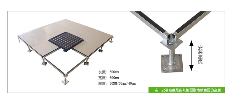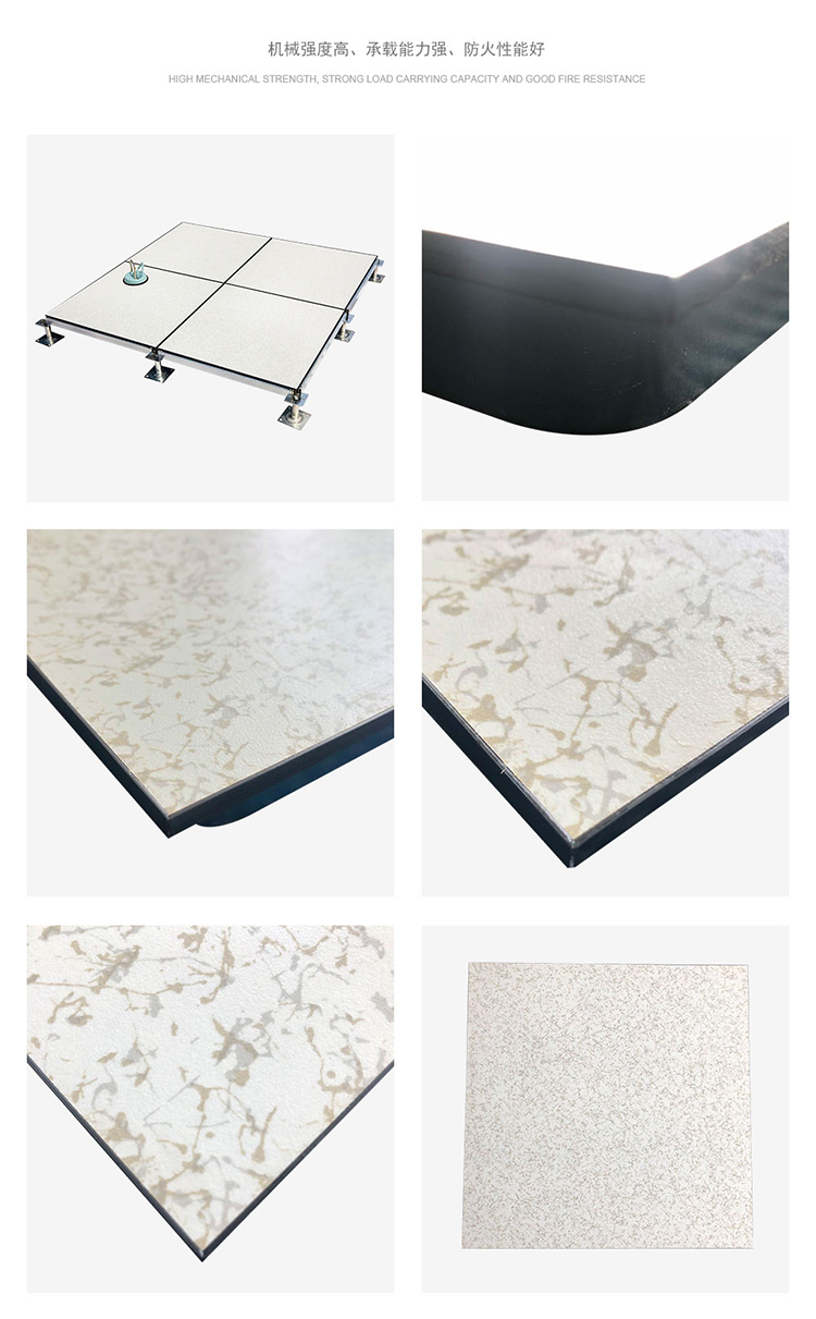 全钢防静电地板为全钢组件,分有边、无边、微边(三种边处理方式)。底面采用SPCC深冲冷轧板拉伸成型钢板厚度(0.4~1.5mm),球窝状结构,增加地板的机械荷载强度。面板采用硬质SPCC钢板(0.5~2.0mm),上下经过点焊焊接成型,切边冲孔后,经防锈处理,环氧树脂粉末静电喷涂后,中间填充发泡水泥(可以根据客户需求发泡不同重量),再经过日晒养护后形成稳定的承载结构。地板上表层粘贴防火板(HPL)/复合PVC/ 通体PVC/陶瓷地砖等不同材质的装饰表层,达到产品花色的多样性、可以根据客户需求个性化定制产品。搭配联网支架、支架、螺钉组装后,定位联接更加准确、精度可靠。