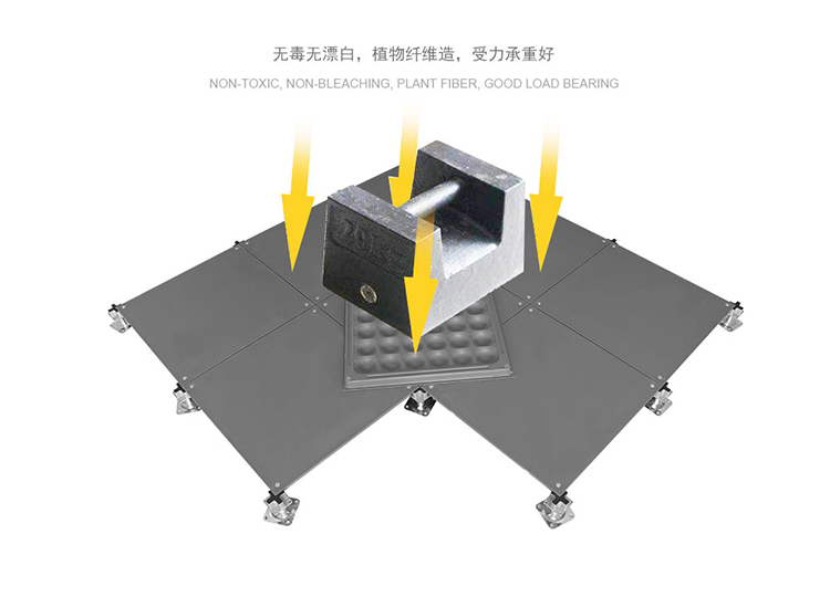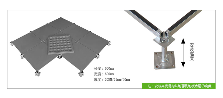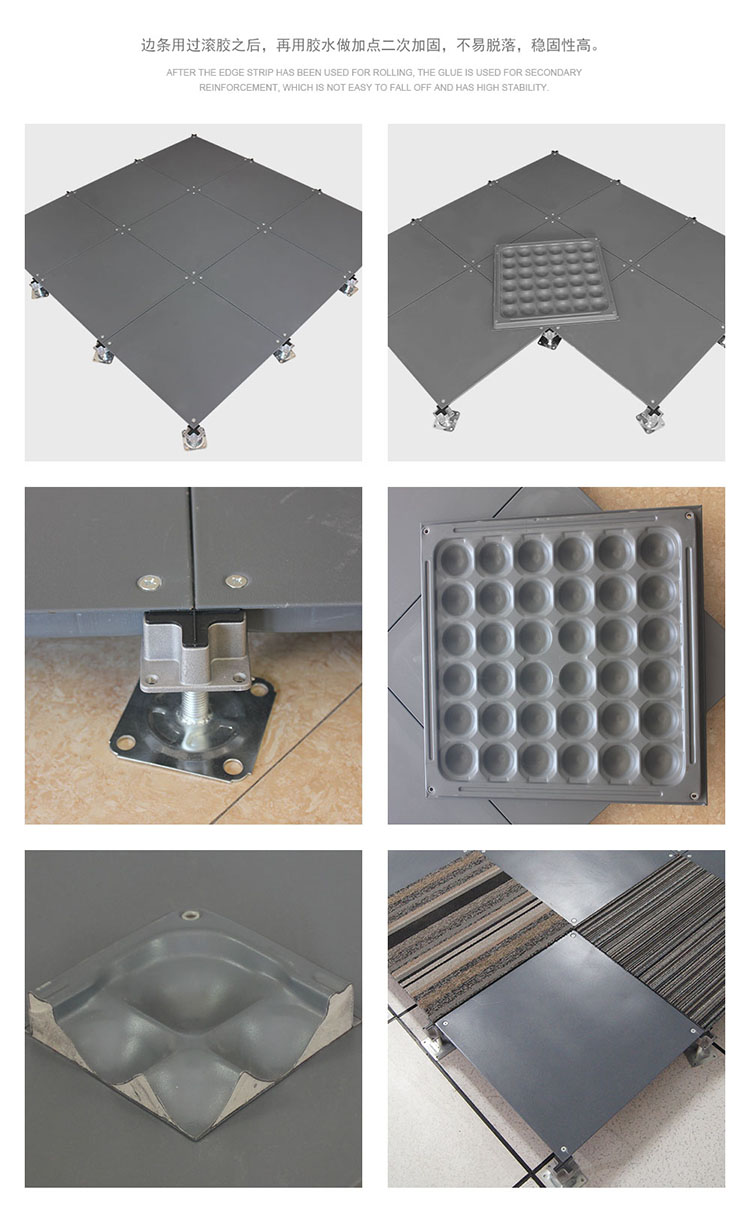 该地板可以选配带出线口的配置,可根据要求任意添加线槽布线更具灵活性。此地板可以将强、弱电分开隔离,同时也便于检修。安装采用无梁角锁,具有牢靠、稳定、调平、简便之特点。