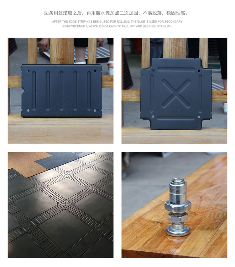 OA(线槽)网络地板其结构为四角独立支撑结构,扣槽式线槽盖板使地板安装完之后连接稳定,不松动,地板采用钢板经拉伸成型、点焊、喷塑、内腔填充 发泡水泥填料,支座为镀锌,高度可调并能自锁。主要组件有:地板、边盖板、角盖板、角底板、支架。