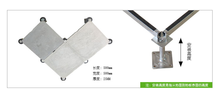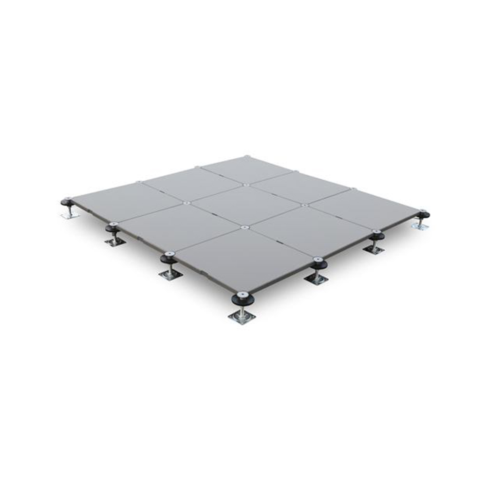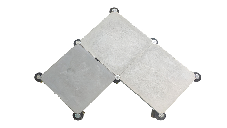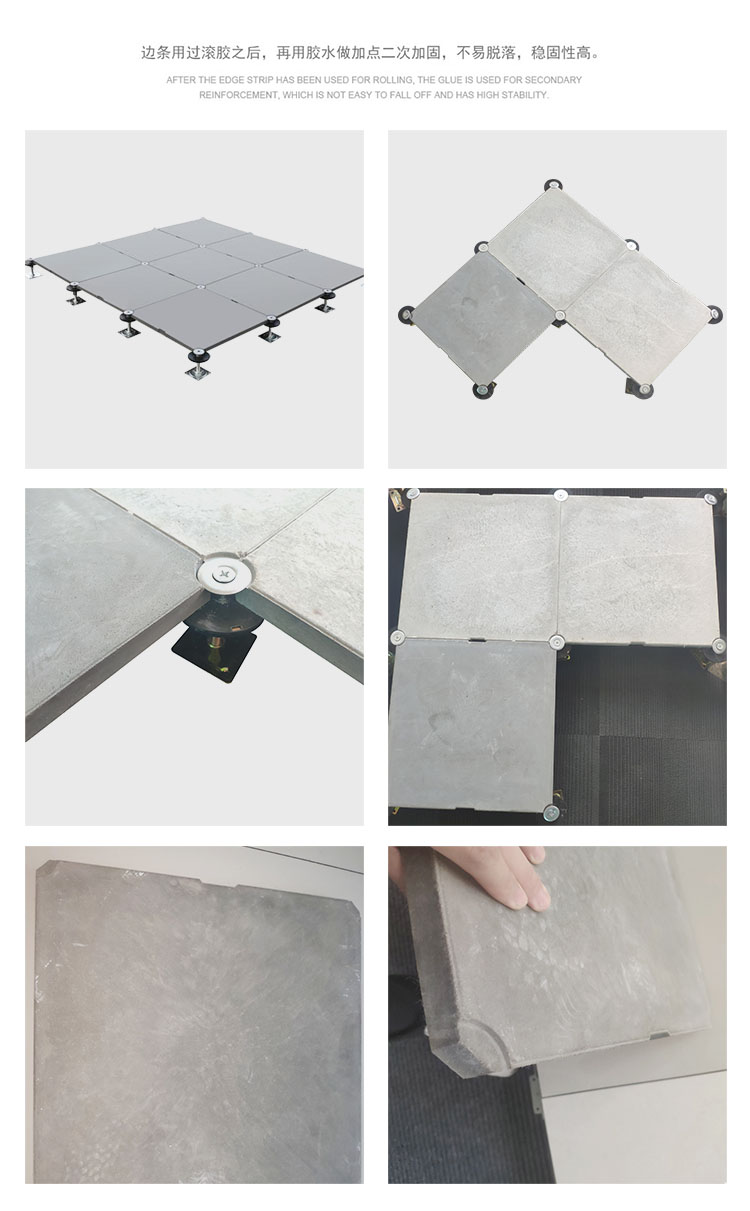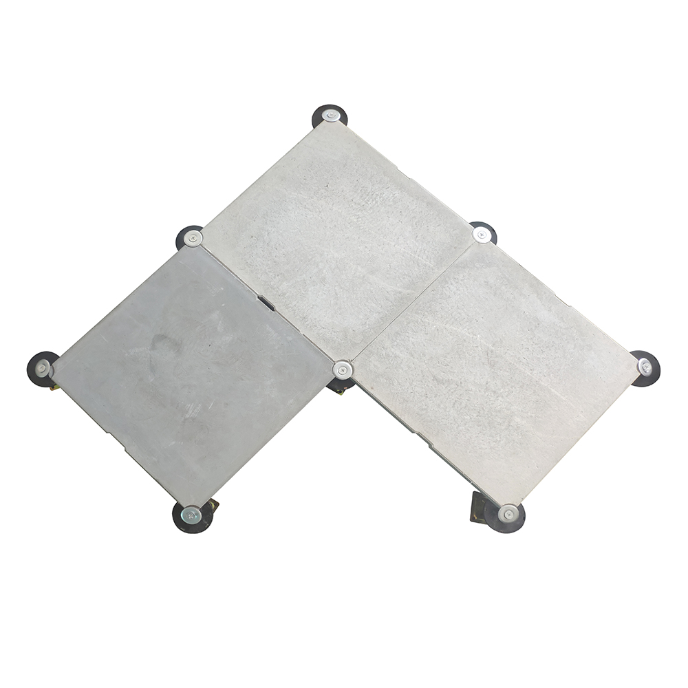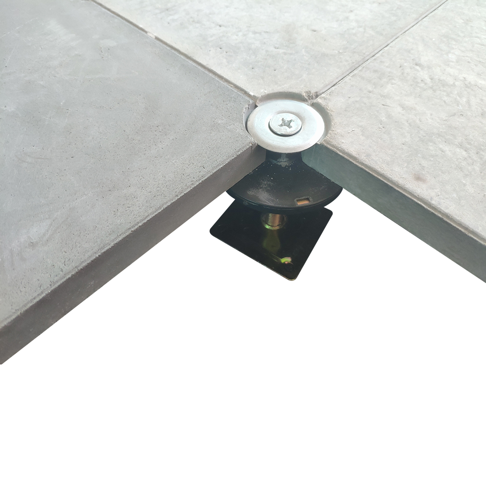 GRC水泥地板是由硅酸盐、无机纤维、矿物纤维、石英砂等材料经过高压一次成型的环保地板,每块地板自带穿线孔。地板四角镀锌底座支承,不带横梁系统。每块地板四角有90度圆弧,四块板组合而成后形成一个圆,有一个铁制螺母压角固定。铝头上配有圆形缓冲定位橡胶垫,防止地板受力后颤动引起的响声。支架高度可调5cm。